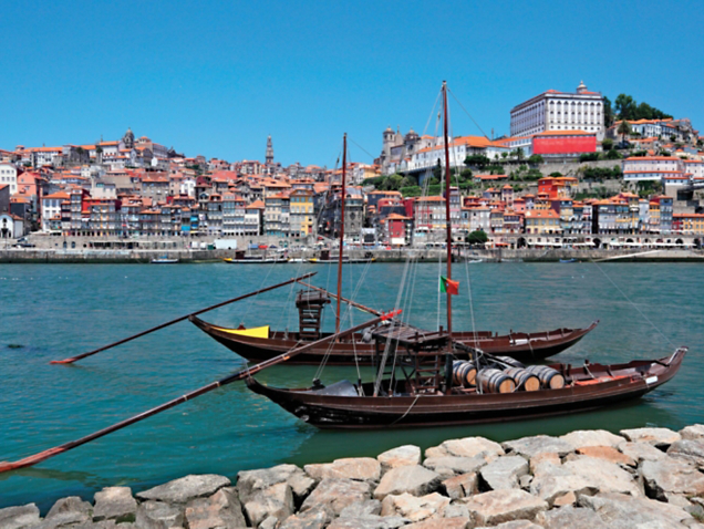 Traditional boats on the Douro River, with a view of Porto’s old town in the background.