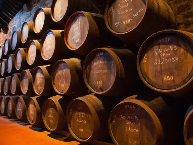 Wooden barrels hold port fortified wine to mature in wine cellars.