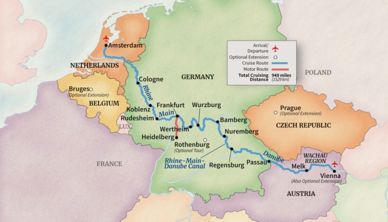 The Netherlands: Amsterdam | Germany: Cologne, Koblenz, Rudesheim, Heidelberg, Wertheim, Wurzburg, Bamberg, Nuremberg, Regensburg, Passau | Austria: Melk, Vienna