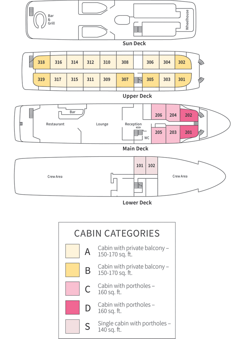 Owned, operated, and staffed by Overseas Adventure Travel, the M/V Artemis small ship was designed exclusively to carry two small groups of 20-25 travelers (average of 22) from the Aegean to the Adriatic seas. On the main deck, you’ll find our reception area and ship’s library. For relaxation, the lounge/bar features inviting leather couches and soft chairs. Topside, a Sun Deck—with a bar and open grill area—has classic wooden deck chairs for admiring the scenery. When it’s time for meals, our large dining area at the stern features an open seating policy. While cruising, we’ll enjoy daily breakfast buffets; sit-down lunches, and dinners featuring international and local specialties paired with regional wines. And for a restful night’s sleep, there are 26 cabins—24 twins and 2 singles. Each cabin features an identical private bath with shower, and includes a movable bed, flat-screen TV, telephone, safe, mini-refrigerator, individually-controlled air-conditioning, hair dryer, and dual electrical outlets.